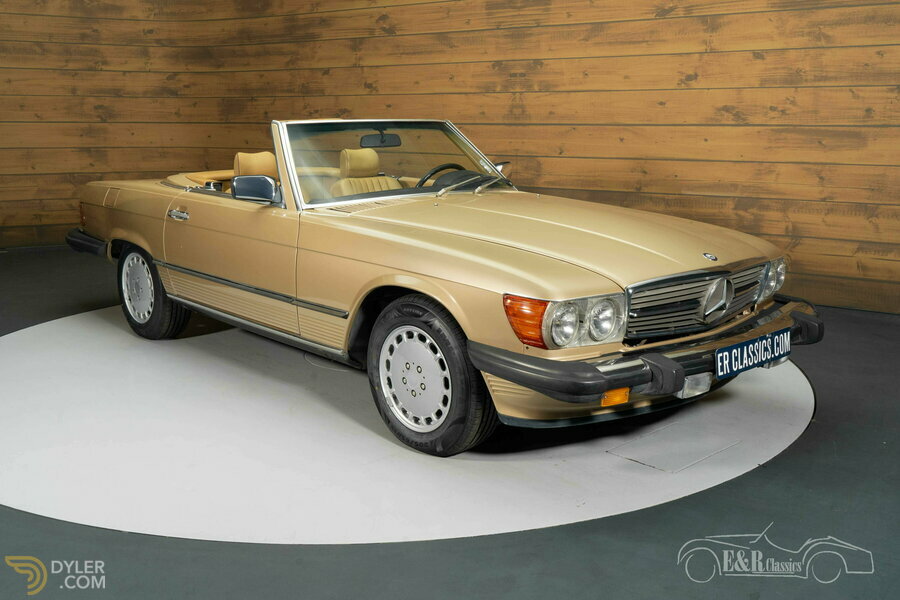 Golden Mercedes-Benz 560 SL for sale Visually, this 560 SL radiates pure class with its golden paintwork, beautifully combined with the dark brown soft top. The interior is finished in stylish tan leather, which, together with the wood inlay and classic lines, creates a warm and luxurious ambiance. The alloy wheels and sleek body lines highlight the sporty yet chic character of this convertible. Whether the top is up or down, this Mercedes-Benz is a stylish appearance that draws attention everywhere.