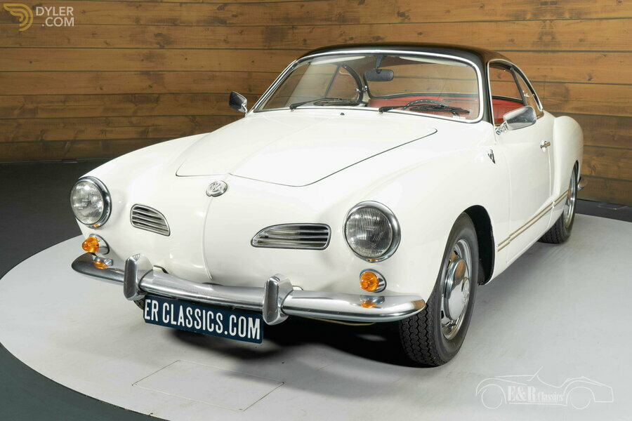VW Karmann Ghia Coupe in Pearl White for sale The elegant Pearl White paintwork with a black roof perfectly emphasizes the Karmann Ghia's rounded shapes and graceful silhouette. The interior beautifully captures the 1960s style with its red upholstery and wood-trimmed dashboard. The car exudes class and originality, with original components meticulously preserved during the restoration. A stylish and technically sound classic, ready for a new owner with an eye for craftsmanship and design.